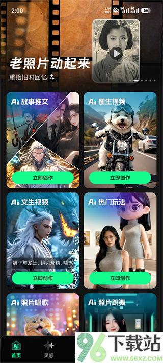 1、打开App首页,你会看到“老照片动起来”“AI故事推文”等一排功能入口,点哪个都能直接开干。