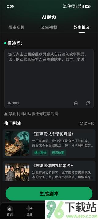 2、比如点进“AI故事推文”,你可以自由输入想法,比如“一只猫在雨天救了迷路的小狗”,也可以直接选现成的热门剧本模板。