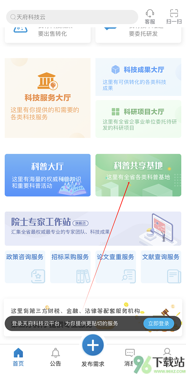 1、先打开天府科技云App,在首页找到“科普共享基地”这个入口,点进去就行;