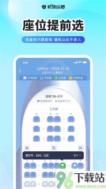 跳转到选座界面后,飞机座位图就出来了。靠窗、过道、前排……喜欢哪个位置直接点,选好后确认提交就行。整个过程不用跳转到航司页面,全程在App里搞定,挺顺手的。