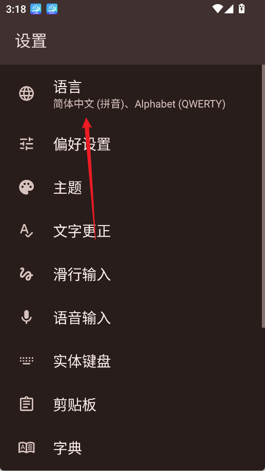 3、进入键盘设置页面后,点顶部的“语言”选项。