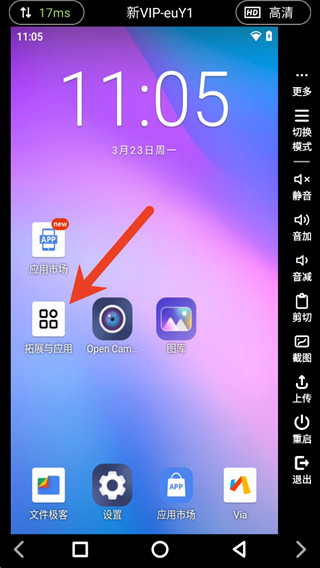 1、打开App,进入已经激活的云手机界面,找到底部菜单里的“拓展与应用”选项,点进去。