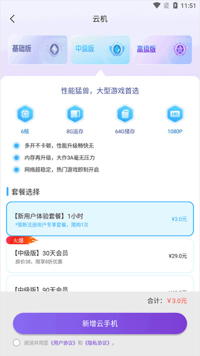 最后挑个合适的套餐,确认后点“新增云手机”,几秒钟就能用上了