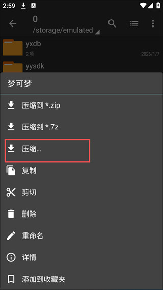 2、长按选中你想打包的文件或文件夹,底部会出现“压缩”选项,点进去