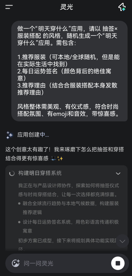 当然你也可以自己发挥创意写指令,描述得越细致越有创意,最终生成的应用质量就越好