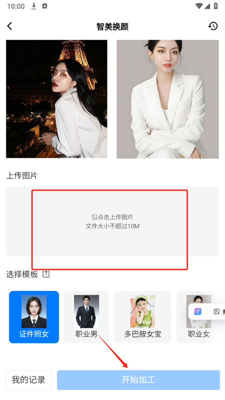 3. 挑一个感兴趣的智能体,比如美颜类的,上传照片后点“开始”,系统会自动处理出优化后的效果。