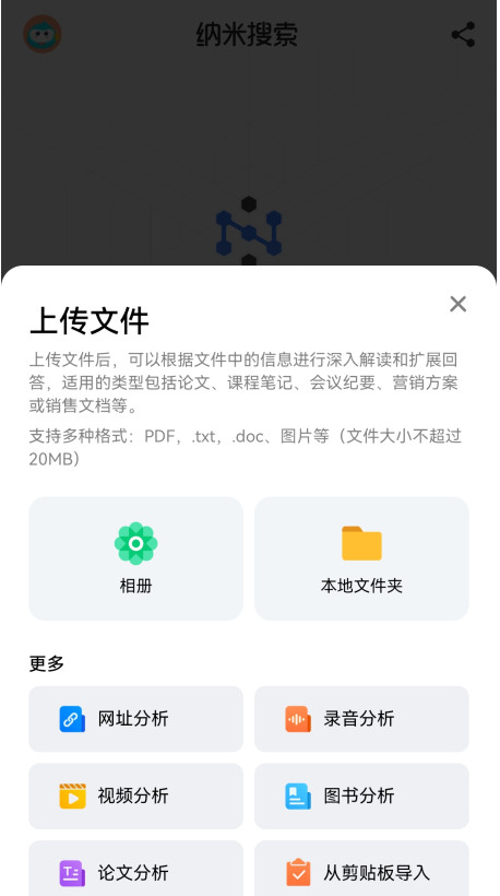 4、支持上传PDF、音频、视频等54种格式的文件,系统会自动读取内容,整理成结构化的知识图谱,方便后续查找和引用。