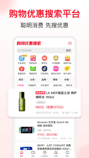 省钱快报官方最新版=“剁手党”的贴身薅羊毛管家,淘宝、天猫、京东、拼多多海量隐藏券一键搜,先领券再下单,价格直接砍到小腿,9.9包邮、限时秒杀、1元爆款天天有,新人首单再返现金,可提微信,从口红到猫粮,从家电到机票,想买啥搜一下,几乎都有内部价,一句话:同样的预算,让你多买好几样,还能倒找零钱。