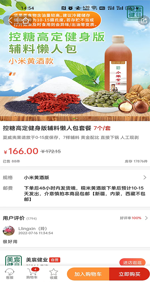 3、在商品详情页查看认证信息、用户评价后,可将商品加入购物车。