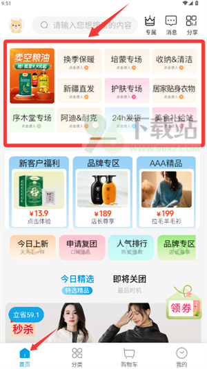 2.首页设有“卖空粮油”“换季保暖”等主题专区,可按生活场景快速浏览推荐商品;