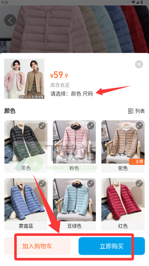 3.进入商品详情页后,选择颜色、尺码等规格,点击【加入购物车】或【立即购买】完成下单流程。