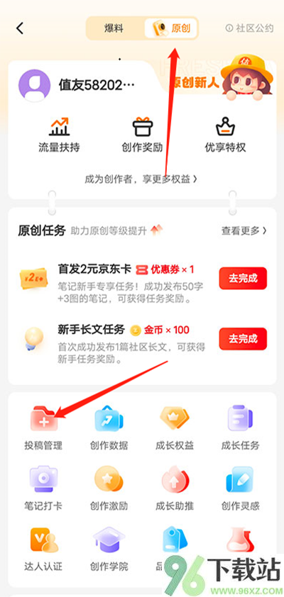 3、顶部会看到“原创”选项,点开后进入投稿管理界面。