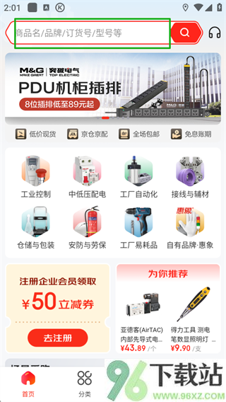 1、打开App,在搜索栏里输入你要找的东西,不管是商品名、品牌、型号还是订货号,都能快速定位。