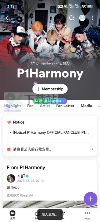 3、当页面显示“已加入”状态,说明你已成功成为该艺人社区的一员,可以开始互动啦!