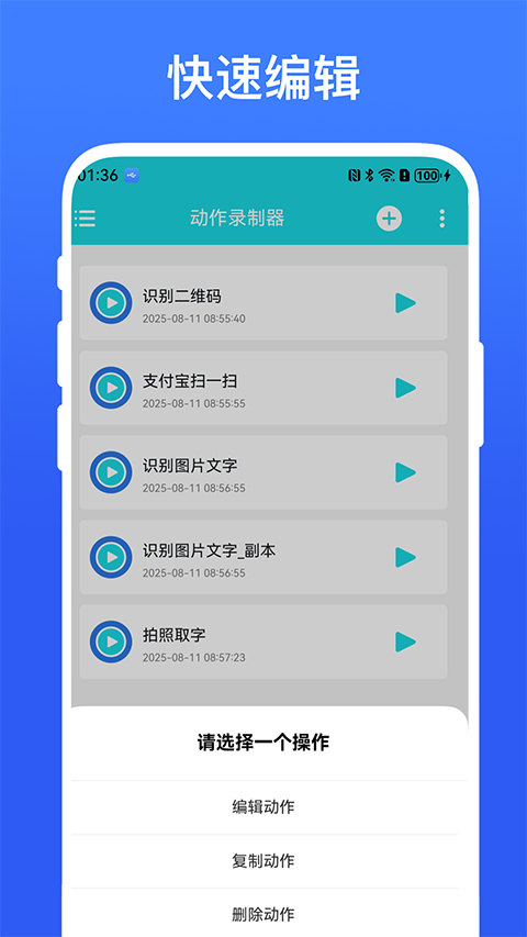 动作录制器app是给那些天天重复点同一个按钮、刷同一个页面却手酸的朋友们准备的省力神器,很多人抢红包、抢车票、秒杀、签到、刷图这些事儿每天都要干好几遍,手指点到发麻还容易漏,用了这款软件直接录一次动作,点开始录制、做完你想重复的操作、再点停止,它就把你所有点击、长按、滑动、返回这些动作全记下来,保存成脚本,下次想再干同样的事儿,直接点脚本一键执行,手机自己跑你喝茶看剧都行,无需root权限,只给悬浮窗、无障碍这些基本权限就能用,界面干净没广告,启动快不卡机,脚本还能导入导出,大佬做的现成脚本直接拉进来就能跑,省得自己从头录,定时执行、循环次数这些也能设,自动收能量、定时打卡、快速抢单这些全能搞定,用了之后你会发现,以前那些重复劳动全交给手机了,手指解放出来,效率高到飞起,生活瞬间多出大把时间,下载后基本每天干重复活儿前都会先打开录个脚本或者跑现成的,省心省力又爽。