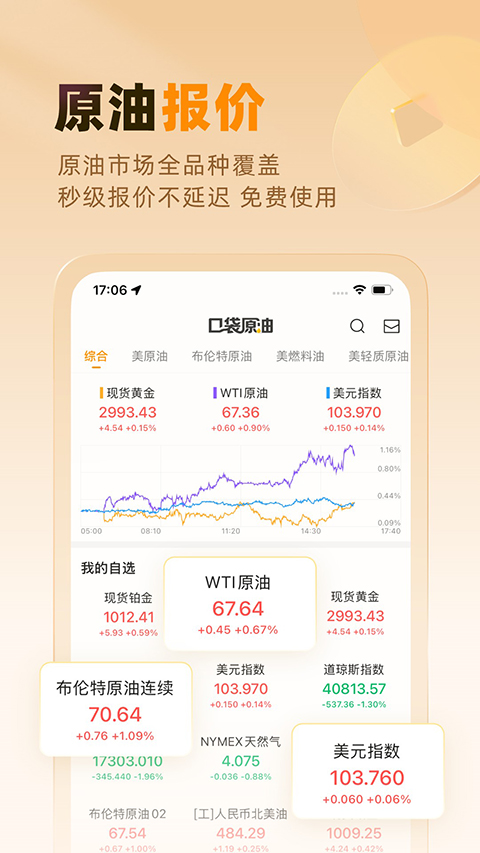1、打开口袋原油APP直进行情页面,综合面板原油美元黄金三者行情涨跌关系直接显示明了。