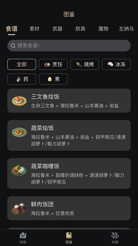 3、点下方图鉴入口进去,食物制作方法服饰获取来源全列着,滑滑就找到想配的方子了。