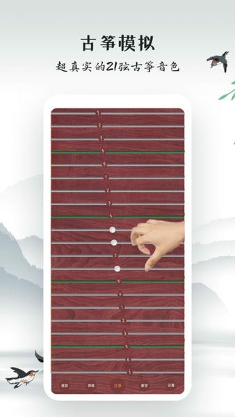 古筝模拟是一款在手机上复刻真实古筝弹奏体验的工具,把21根琴弦的排列和音色都搬进了屏幕里,它不只是个玩具,调音器、陪练、教学、考级这些功能全包了,从完全不懂到能弹完整曲子都能用,界面走的是古风路线,琴弦用3D渲染,拨动时有视觉反馈,比平面按钮更有临场感,曲谱库给得挺大方,免费曲目数量够练一阵子,跟弹模式会高亮提示下一步按哪根弦,节奏错了还会提醒,调音器功能对真琴用户也实用,手机麦克风拾音,比传统调音笛快准,所有歌曲下载到本地后离线也能练,地铁上或者信号差的地方不影响使用。