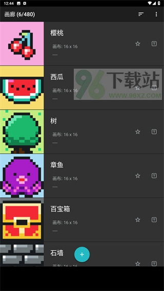 1、打开App首页,能看到精选像素作品示例,点右下角“+”号可新建画布或导入自己的图片;