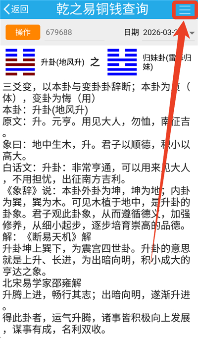 1、在任意占卜或查询结果页面,点击右上角的三条横线(≡)菜单按钮;