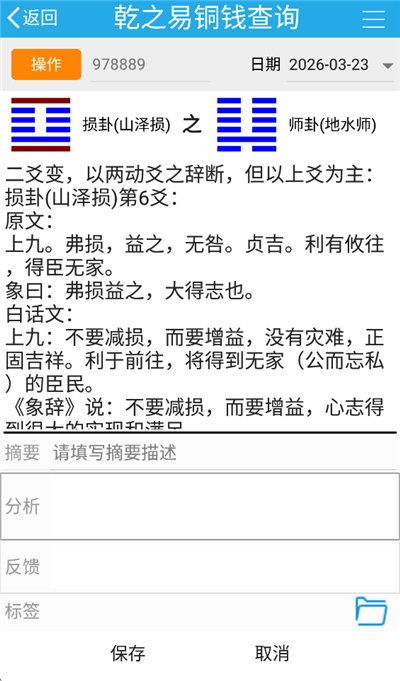 3、填写本次卦例的摘要、分析思路、实际反馈(如事后验证结果)及自定义标签,便于日后分类检索,完成后点击【保存】;