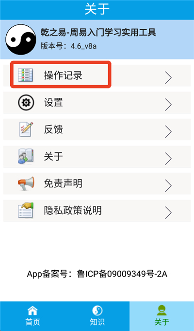 4、要查看历史记录,进入【关于】页面,点击第一项【操作记录】;