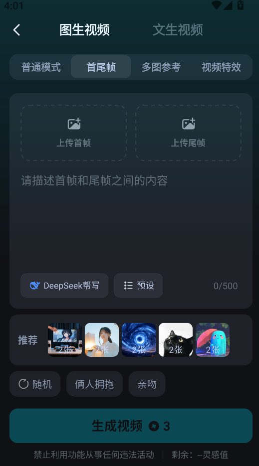 4、图生视频功能细分出普通模式、首尾帧控制和多图参考三种方式,能更好地匹配不同类型的素材和创意需求