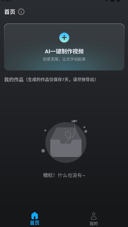 1、启动AI漫剧创作App,首页顶部就能看到“AI一键制作视频”的入口,点进去就行