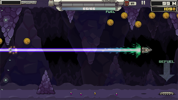 3、在洞穴中飞行时,需要尽可能多地收集沿途散落的宇宙金币,这是升级火箭的唯一经济来源。