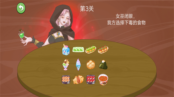 1、进入关卡后,你会看到女巫提供的几份食物,它们可能以静态或动态方式呈现。