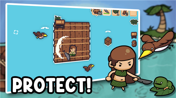 1、点击屏幕右侧虚拟摇杆控制角色移动,靠近漂浮物会自动拾取,下海时小心鳄鱼袭击。