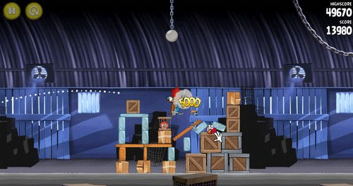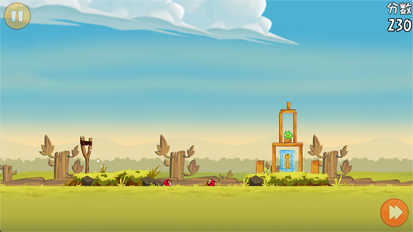 继续用蓝鸟,但这次要在快撞上前才分裂。确保至少有一只命中底部关键支撑,否则上面的笼子根本不会掉。