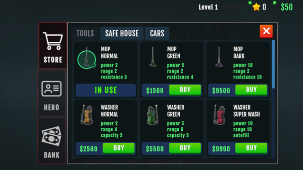 有时你现有的装备不够用,需要额外助力。要是灯具或手电筒亮度不足,就换新款!户外血迹过多,就更换高压清洗机喷嘴!因此每次任务前,务必查看可用增益道具,升级你的清洁装备库。能让工作更轻松,何不一试?