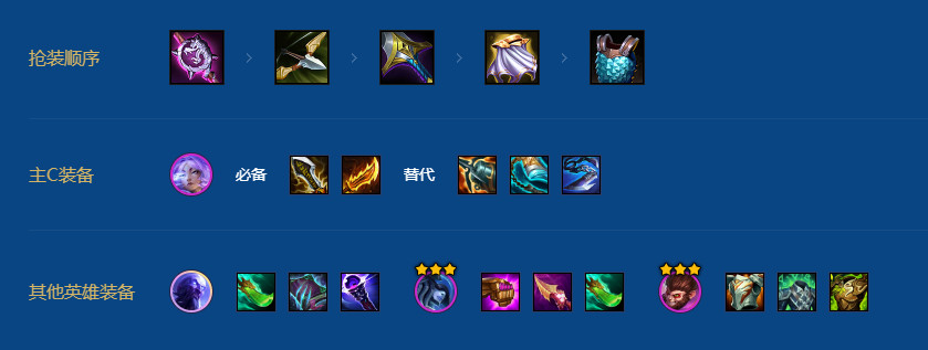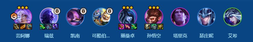 装备分配:芸阿娜当主C,丽桑卓副C,瑞兹带辅助装;孙悟空吃所有前排装,塔里克有剩的肉装就给他。