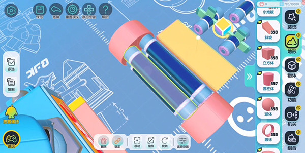 先用扇形圆台做大圆柱的两头,中间填四个圆柱,把它们和对应的圆台绑定。然后在中心轴位置放个圆柱体,把它和周围的圆台绑定,再给这个圆柱体加上滚动的运动器。这样一来,大圆柱整体就能像滚筒一样转动了。