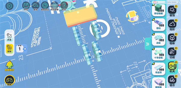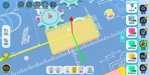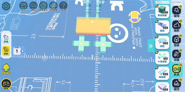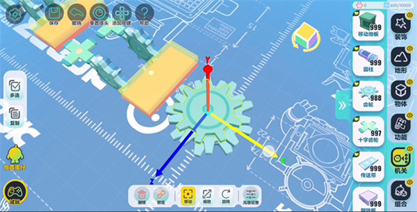 为了操作方便,建议先把设置里的视角改成【上帝视角】。在机关列表里找到“齿轮”拖出来就能摆。除了平放,还能点【旋转】把它立起来,或者用【缩放】调整大小和厚度。调好一个觉得满意了,点左边的【复制】直接批量复制,这样效率高很多。