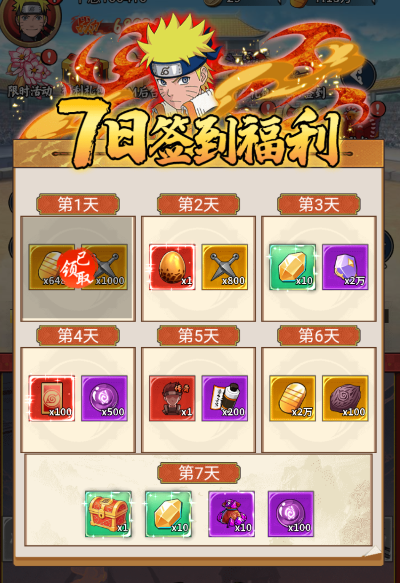 第二天就能挑一只红色异兽带走,第五天送随机传说忍者,第七天更是直接给传奇忍者自选,基本开局阵容就齐了。