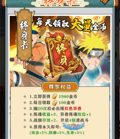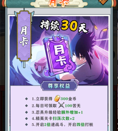 买一张月卡,立刻到账300金币,之后每天还能领100苦无,性价比挺高。