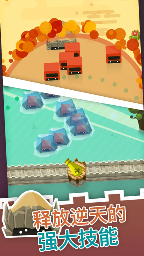 战斗中可随时释放强力技能:全屏冰冻控场、投掷巨型炸弹、瞬间修复城墙、召唤金币雨、甚至开启“无敌护盾”免疫伤害!合理搭配技能时机,轻松化解BOSS突袭。