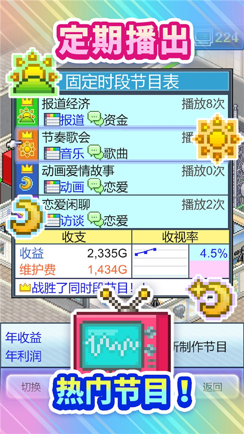 喜欢开罗游戏的朋友们绝对不能错过这款开拍电视制作物语,它完美继承了经典的像素画风和让人欲罢不能的模拟经营玩法,这次你不再是经营餐厅或游乐场,而是摇身一变成为了电视台的总负责人,在游戏里你得从零开始打造王牌节目,不仅要费尽心思挑选合适的主题和布景,还得亲自招募摄像、导播这些员工来干活,最重要的是你得时刻盯着收视率,甚至还要想办法把当红的大明星请到演播室来撑场面,争取做出全网热搜的爆款综艺,非常适合杀时间。