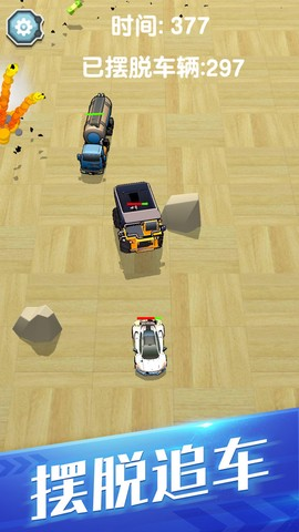 1、玩家在飞车大乱斗进化里要做的就是甩掉追兵,一路狂飙逃生。每局开始警车就追着你不放,得靠自己灵活走位,在高速行驶中不断变换车道,冲出包围圈,目标就是跑得更远活得更久。