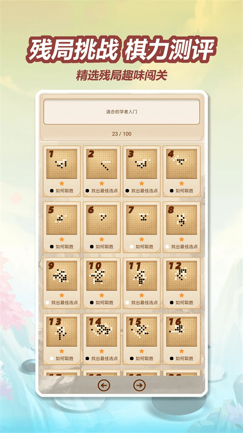 4、包含“历练闯关”式的残局解谜玩法,玩家需要破解预设的棋局,锻炼棋感并获得奖励。