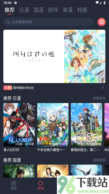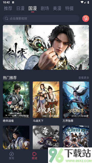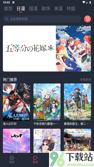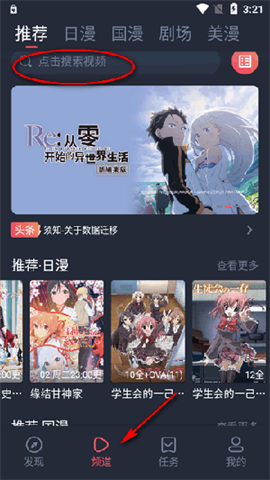 2、安装完成后打开应用,在频道页面的搜索栏中,输入你想看动漫的关键词,即可进行搜索。