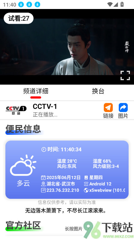 4、进入任一直播频道后,视频会自动开始播放,上下滑动可调节音量和亮度,不影响正在观看的画面内容。