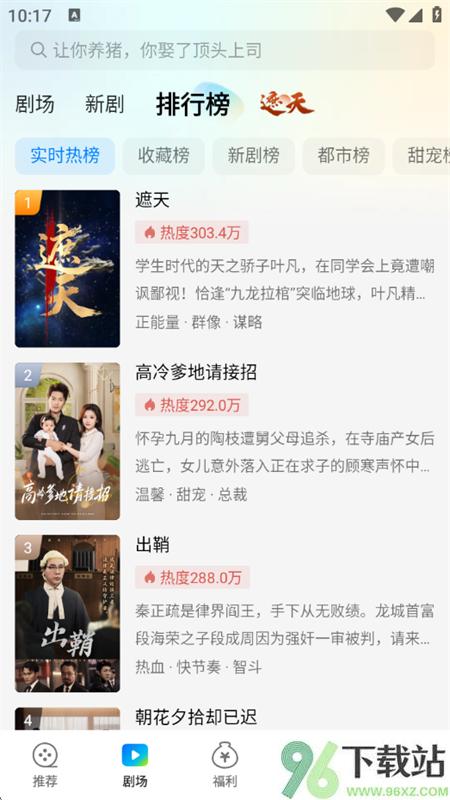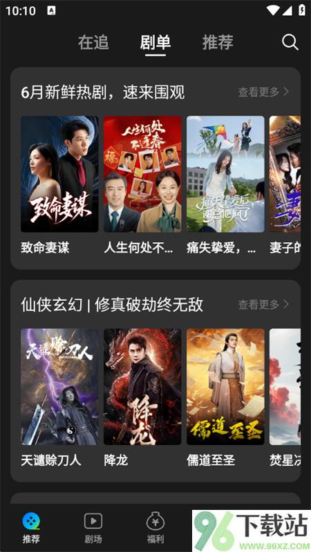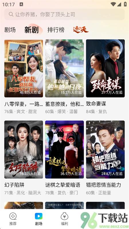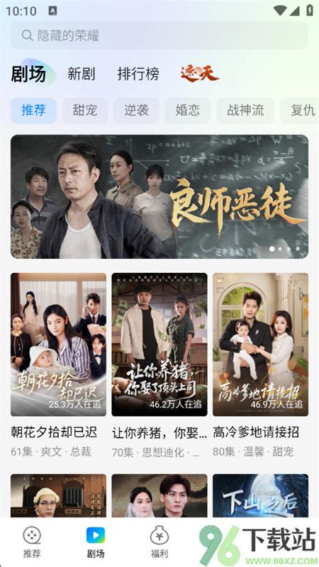 3、进到首页后点“剧场”或者“推荐”栏目,热门短剧一排排列着,随便点一个就能开看。