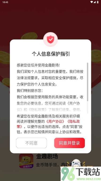 1、下载安装金趣剧场app之后,打开应用会提示你阅读使用条款和隐私政策,点同意才能继续下一步操作。