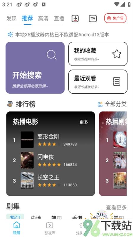 1、先在96下载站下载鲸看Pro安装包,安装完成后打开应用,首页会直接展示当前热门的影视剧推荐列表。