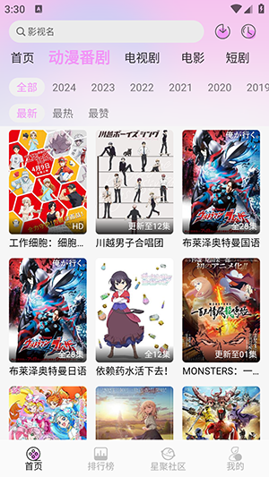 1、打开App后在首页可以快速看到正在更新的热门动漫资源,新番资讯和剧场版推荐都会集中展示,方便用户第一时间了解最新动态。