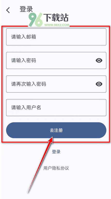 3.请按照软件要求输入邮箱、密码、再次输入密码、用户名,然后点击去注册即可。