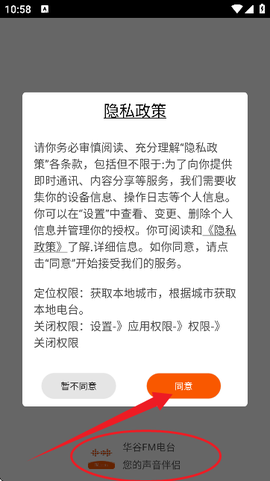 1、下载安装华谷FM电台App后首次打开,系统会提示你阅读用户协议和隐私政策,看清楚后点同意才能继续使用。